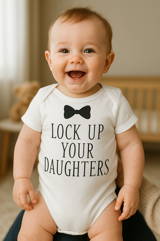 😎 Malý gentleman na misii: LOCK UP YOUR DAUGHTERS! Biely body s krátkymi rukávmi, odvážnym čiernym nápisom a roztomilým motýlikom hovorí presne to, čo si všetci myslíme – váš drobec je už poriadny šarmér.