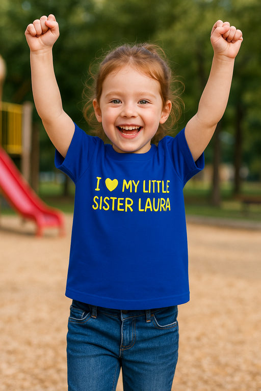 💙 Srdce na rukáve? Takmer! S nápisom „I ❤ MY LITTLE SISTER LAURA“ sa láska blyští priamo na hrudi! Kráľovsky modrá farba + slnečne žltá potlač = kombinácia, ktorá z malého hrdinu spraví hviezdu ihriska aj rodinných fotiek. Keď dieťa zbožňuje svoju sestričku, nech to vidí aj susedov kocúr – tričko to povie hlasnejšie (a rozkošnejšie) než megafón.