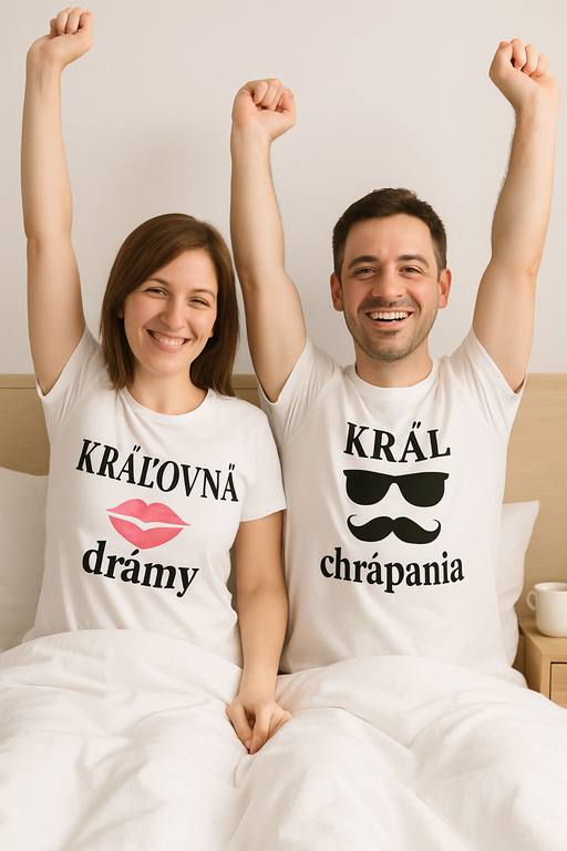 Pre všetkých, čo vedia, že kráľovské koruny môžu mať rôzne tvary! Táto sada tričiek „Kráľ Chrápania a Kráľovná Drámy“ je ideálna pre páry, ktoré žijú vo vzájomnom porozumení a úcte k svojim nočným talentom. Perfektné na domáce kino maratóny! 👑😴🎭