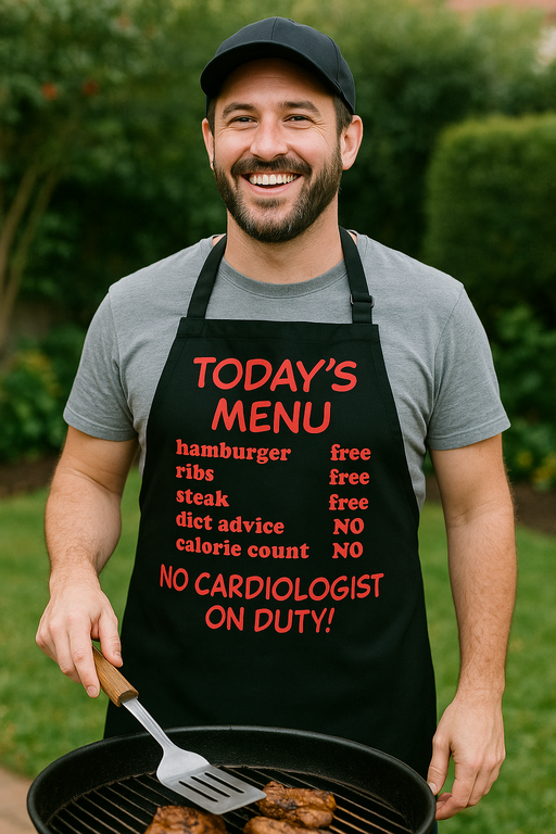 Tento čierny fešák s červenou potlačou je jasný ako dobre prepečený steak: u teba je všetkého dosť, okrem diéty a počítania kalórií. Smiech zaručený, apetít tiež — hostia prídu na „free“ a zostanú kvôli rebrám. Ideálne pre tých, čo ovládajú gril aj punchline.